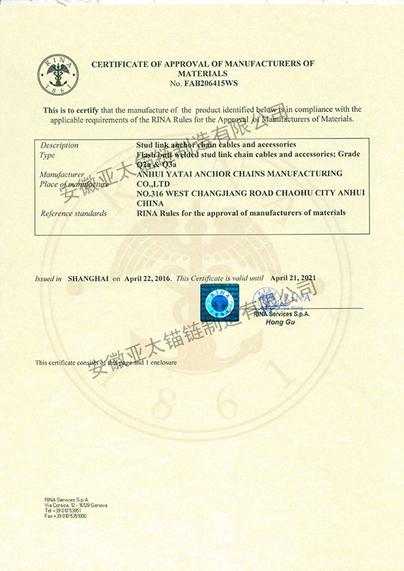 安徽亞太錨鏈制造有限公司是國家高新技術企業(yè),也是國家GB/T 549-2017《電焊錨鏈》標準的起草和制定單位之一。公司旗下設有錨鏈分廠、浮標分廠、舾裝件分廠等多個分廠。公司專業(yè)從事φ12.5mm-φ107mm二、三級船用錨鏈、浮標錨鏈、錨鏈附件,錨、船舶曬裝產品、航標、系船浮、船型標、多種規(guī)格海洋監(jiān)測浮標及航標燈等產品的生產、安裝和服務。目前公司的產品銷往全國各地船廠、碼頭、航標處、航道局、海洋局,并已走上國際市場,如東南亞、中東、歐美等國家。
